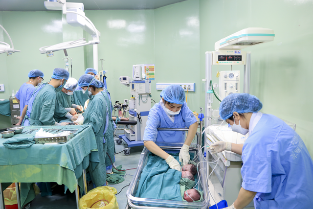Phối hợp ê kip Sản khoa và Hồi sức Sơ sinh thực hiện ca mổ đẻ tam thai tại Bệnh viện Sản - Nhi Nghệ An. Ảnh Yến Phương